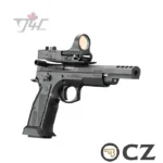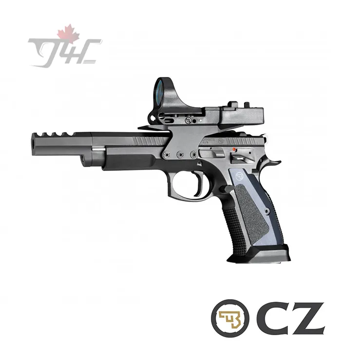 The Czechmate is based on a modified version of the CZ 75 TS frame. It comes with all parts necessary to run in IPSC Open or Limited division (both in 9mm). The Czechmate comes configured for Open division competition with a compensator and C-More red dot sight installed. The included front sight adapter replaces the compensator, and the included rear sight replaces the slide racker handle when switching from Open to Limited configuration