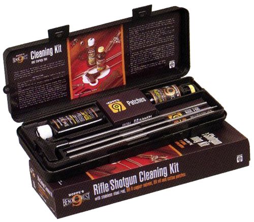 The kit box is made of durable polypropylene. Features include a stronger hinge for longer life double latch for sure even closing and stronger rounded corners to prevent breakage. Includes No. 9 solvent lubricating oil patches pistol rod knob and slotted ends and brush.