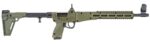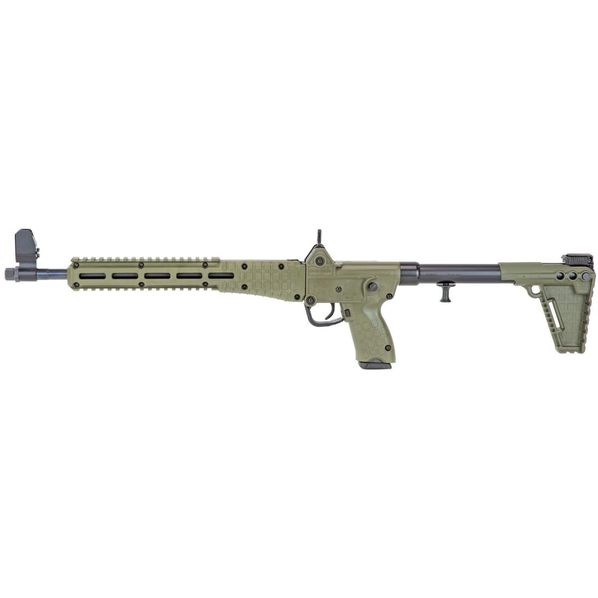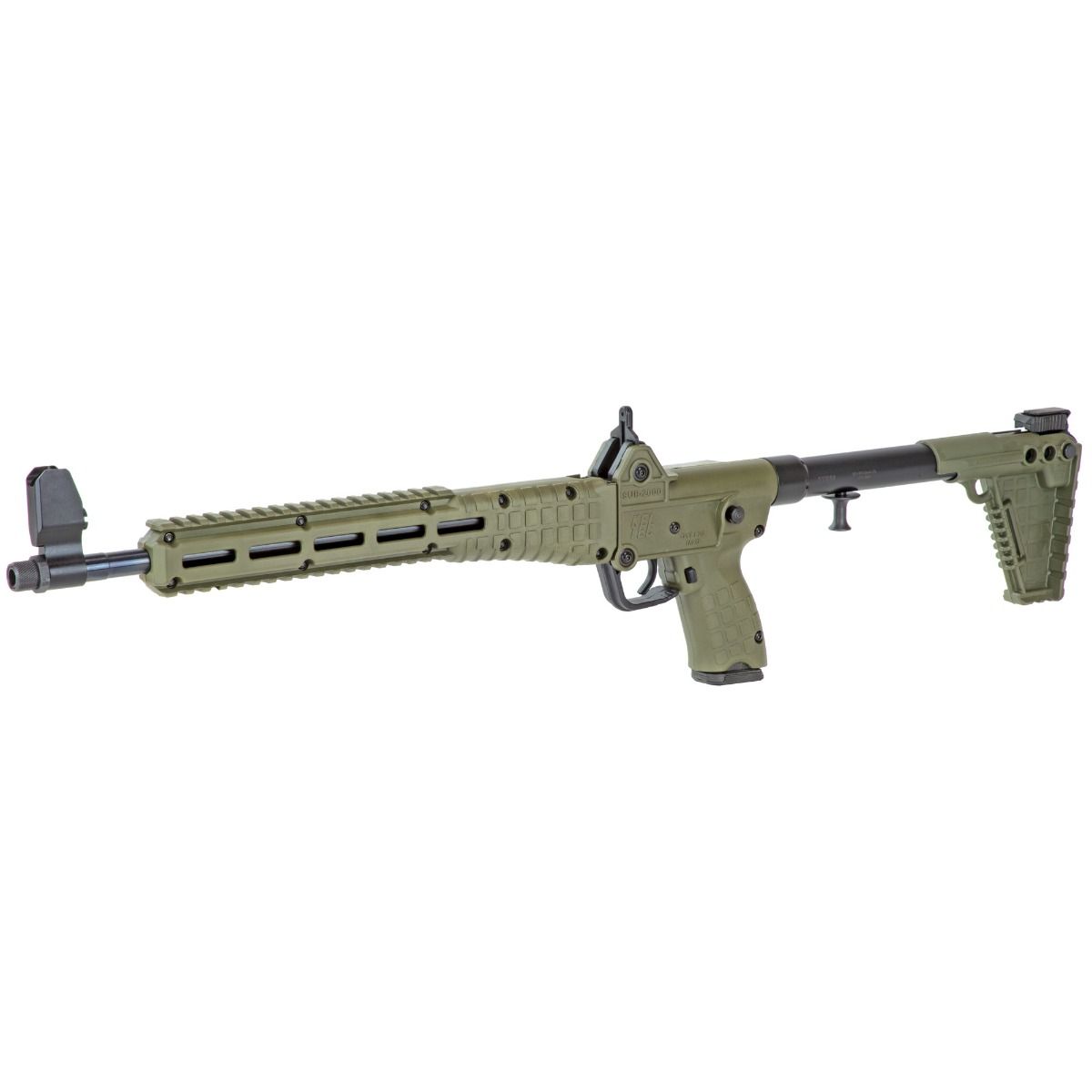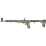 The ergonomic charging handle is located under the bolt tube for ambidextrous operation. The rifle features a ghost ring rear sight and an adjustable front sight with a removable T6 6061 aluminum housing. This model is the ODG version that comes with a 17-round magazine. It is compatible with Glock 17 mags. If your in the market for a lightweigh folding pistol caliber carbine should take a look at the Kel-Tec Sub-2000.