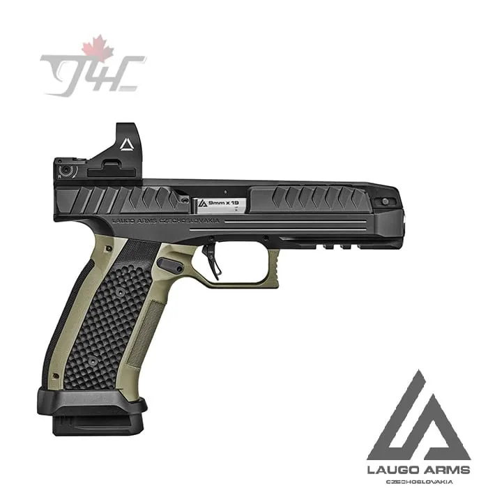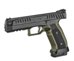 The Alien pistol is a revolutionary new pistol encompassing multiple design innovations, the single greatest engineering milestone in pistol design since the M1911. It all starts with the barrel –it is fixed in position providing superior accuracy without moving parts. It is located on the bottom of the frame, so low in fact that it has the single lowest bore axis of any pistol in the world. In order to achieve this record-breaking low bore axis, the pistol is gas blowback operated, with the gas piston located above rather than below the barrel. The top of the pistol has a fixed top rail. This aides in target#acquisition as the sights are therefore#stationary when shooting. The top rail is also modular and quickly interchangeable for other rails with different sighting systems, such as with a red dot or target iron sights. The added benefit to having a fixed top rail is that the slide is now smaller and has less recoiling mass, further reducing transferred recoil impulses. Due to the barrel being so low the breach face is also lowered, providing for a lower than normal center of gravity. The frame is steel with the entire grip housing being interchangeable. The grip housing is alloy.