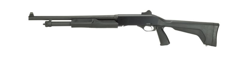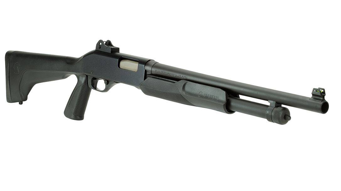 The Stevens 320 Security pump shotgun uses a proven rotary bolt design and dual slide bars. It is a bottom load, right eject, and has a tube magazine with a 5-round capacity. The 320 Security has an 18.5″ carbon steel barrel with a cylinder bore and a blued metal finish. This 20 gauge model has a ghost ring sight and black synthetic buttstock with a pistol grip.