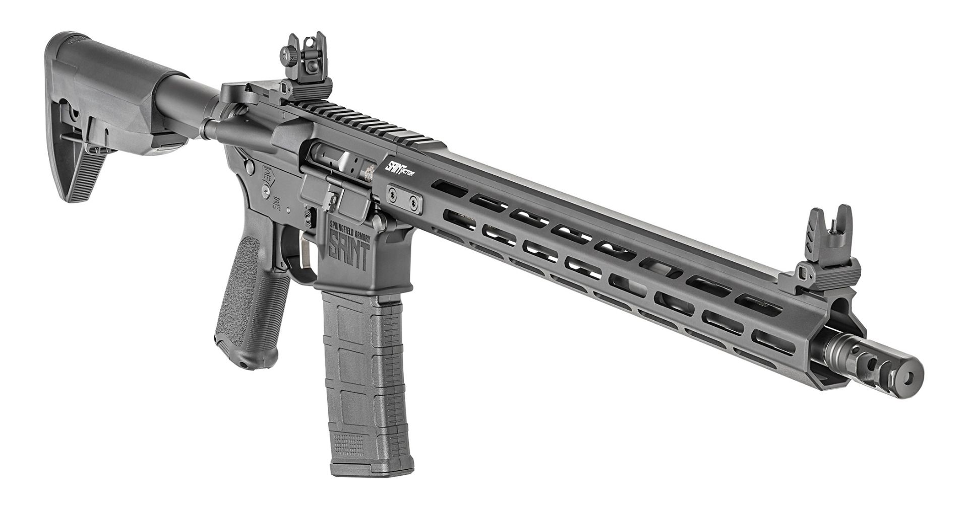 The Springfield Saint Victor rifle sports an aluminum free float M-Lok hand guard with SA locking tabs and Magpul FDE furniture. The Victor is chambered in .223REM/5.56NATO and equipped with a threaded  16″ chrome moly Vanadium barrel with a corrosion resistant Melonite finnish, 1:8 twist and a Springfield Armory muzzle break. A magnetic particle tested M16 bolt carrier group, with a shot-peened Carpenter 158 steel bolt provides durability and reliability under heavy use, while a mid-length gas system with an “H” heavy tungsten buffer mitigates recoil for a comfortable shooting experience. The Springfield Saint features a factory upgraded flat nickel boron-coated GI single-stage trigger for a smooth, grit-free pull that helps you stay on target. Type III hard anodized aircraft-grade 7075 T6 aluminum upper and lower receivers are kept tight and wobble-free with Springfield’s Accu-Tite™ tension system. The Victor model comes equipped with an aluminum Free Float M-Lok hand guard, Magpul MOE stock, Magpul trigger guard, and Magpul MOE pistol grip. The Victor sports adjustable Springfield Armory, low profile, flip-up sights for accurate target acquisition right out of the box.